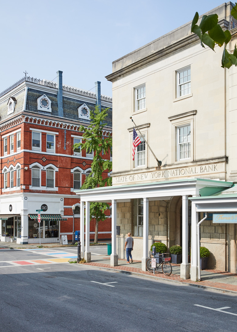 Robert McKinley, a former visual merchandiser for fashion brands that include Donna Karan and Giorgio Armani, was tasked with transforming a former bank into a hotel. "I wanted to move away from typical Upstate 'whistle-call' aesthetic — no antlers, no plaid-on-plaid and reclaimed wood," says McKinley.