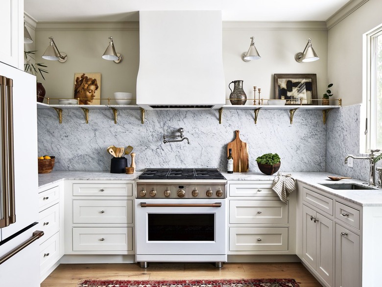 While traditional kitchens aren't big on abstract, contemporary pieces, you can absolutely still include artwork — just make sure it has a traditional feel. That's what Zoë Feldman did in this jaw-dropping design, by capping the marble backsplash with shelving that doubles as a display space for carefully selected works of art and treasured tchotchkes. The articulating wall sconces ensure that each piece will get the attention it deserves.