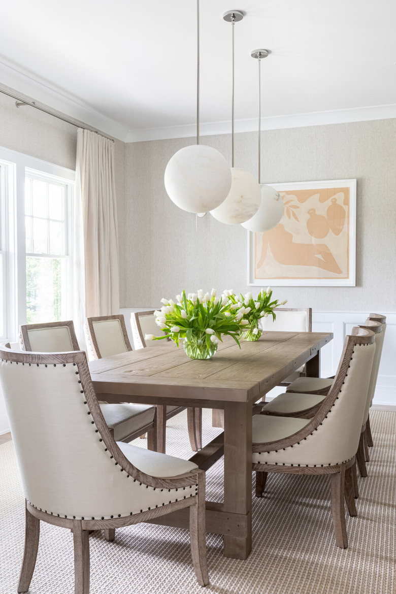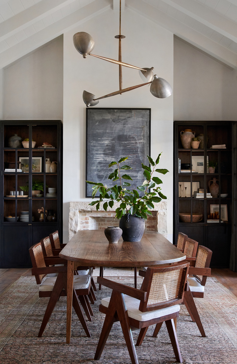 A grand dining table that can span the entirety of the room is a hallmark of traditional style and an essential for hosting gatherings. In this mod-meets-classic space, designed by Studio McGee, the lengthy piece is flanked by a pair of upholstered armchairs that complement the muted scheme while providing a hint of contrast to the wooden details.