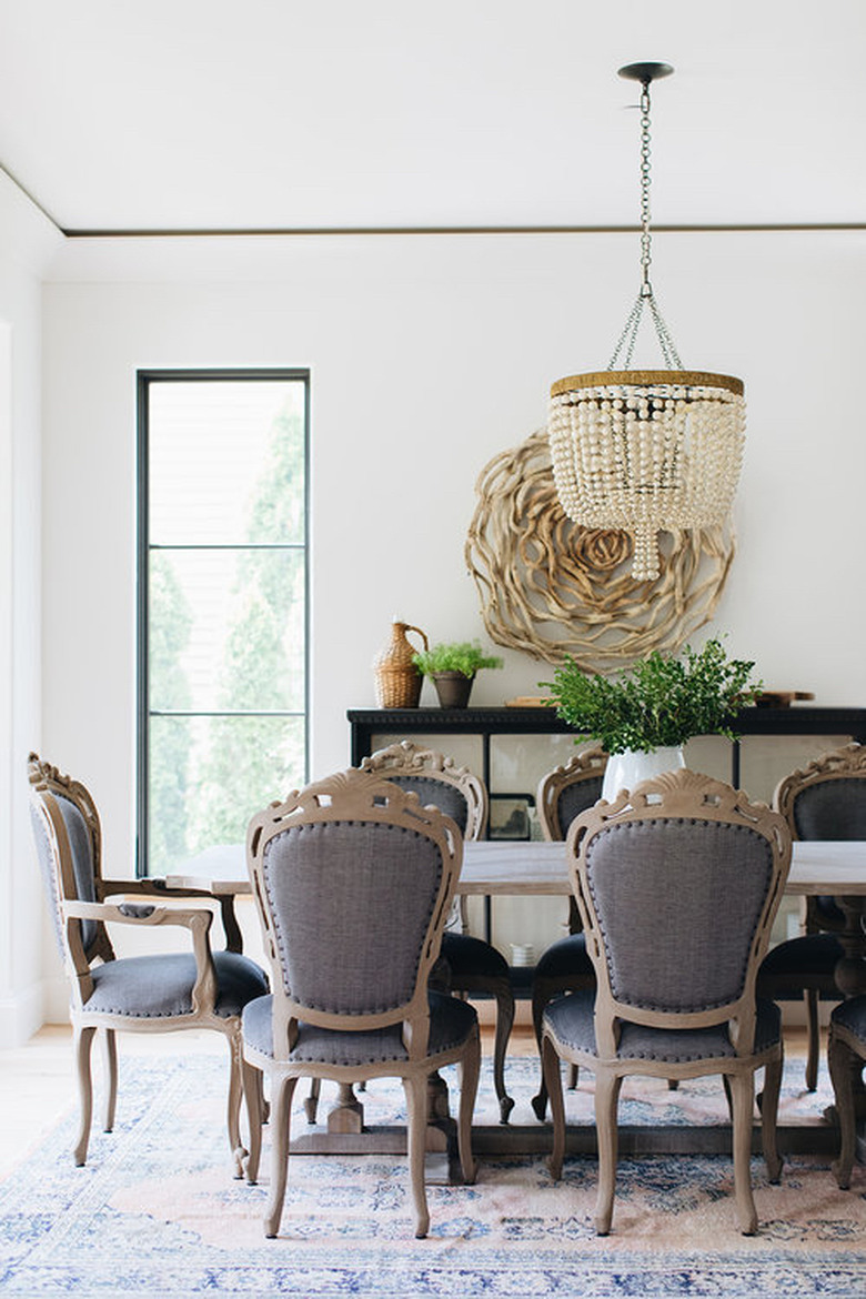 A design-forward light source is what separates an average dinner party from a memorable one. Invest in an oversize pendant and hang it low from the ceiling to anchor the area and draw all eyes to the center of the table. In this spot, designed by Kate Marker Interiors, a beaded chandelier gives a traditional dining room an intimate yet glamorous feeling, while staying true to its timeless roots.