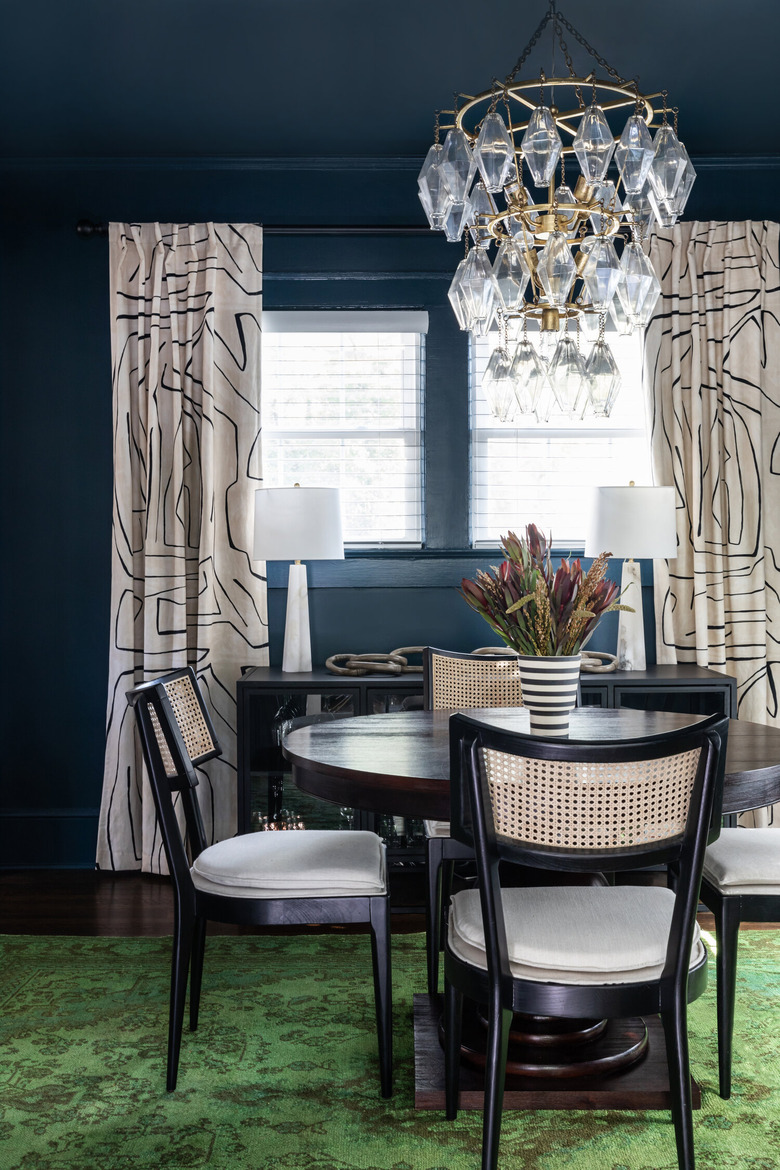 Don't shy away from making a statement, especially when it involves adding a pop of color and pattern to your space. In this moody West Charlotte home, designed by House of Nomad, the graphic window treatments are a respite from the surrounding jewel tones, bringing with them an added touch of lightness.