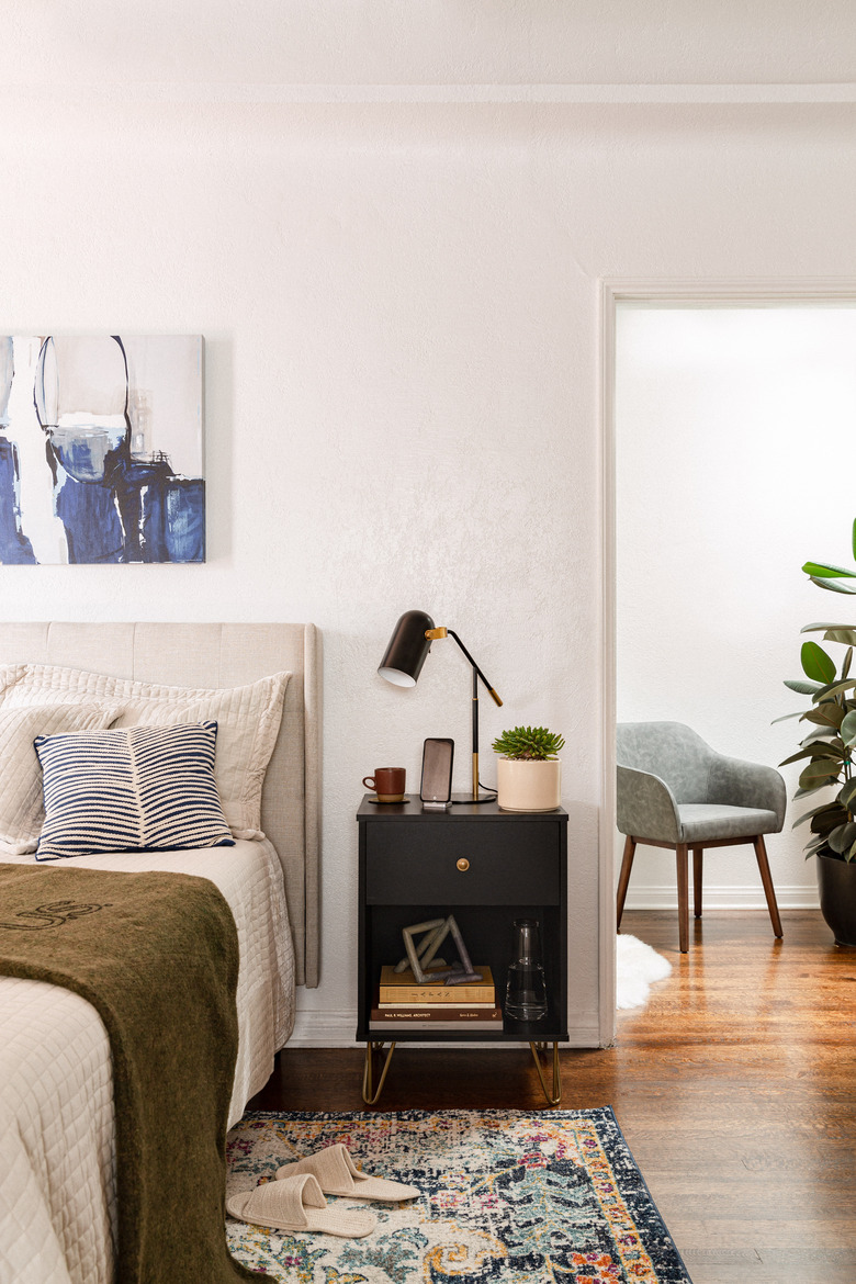 So, what in this space feels traditional? A rug with an antique-inspired motif, an upholstered bed in a neutral color, and a side lamp that has a slight industrial edge. As for the modern elements, try abstract art above the bed, pillows in interesting patterns, and an accent chair that has just a dash of midcentury inspiration.