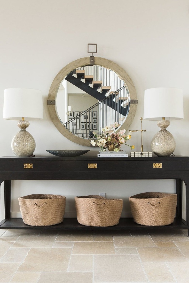 You don't have to opt for rustic furniture styles that are straight from the antique store — you can incorporate homespun pieces with a modern touch. And they'll look great with a luxe setup. Take this entryway designed by Studio McGee. The sophisticated console and lamps feel more relaxed because of the weathered wooden mirror and woven baskets.