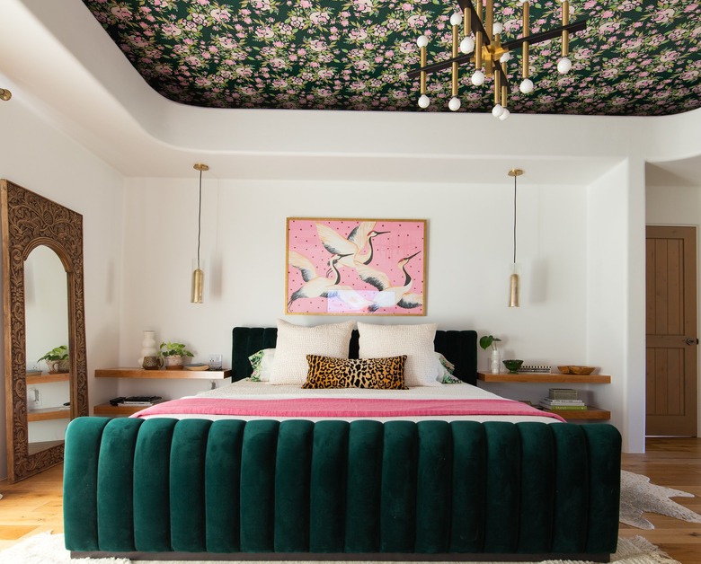 If you love rich jewel tones, a maximalist bedroom is the ultimate space to let them shine. White walls and wide plank wood floors provide a blank canvas that allows the channel-tufted emerald bed, vibrant fuchsia throw, and floral ceiling to take center stage in this room designed by Bari J Designs. Gold light fixtures enhance the elevated vibe.