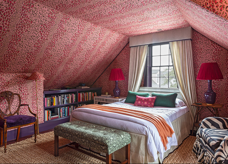 Animal print accents are embraced in many interior design styles — they add texture and pattern while introducing a bit of glam and edge. But successfully blanketing a bedroom in red leopard wallpaper and high-contrast regal purple trim takes guts and could only be the work of a skilled designer like Angie Hranowsky. She gilds the maximalist lily with a zebra-print chair, punchy accessories, and an unexpected classic floral bench.