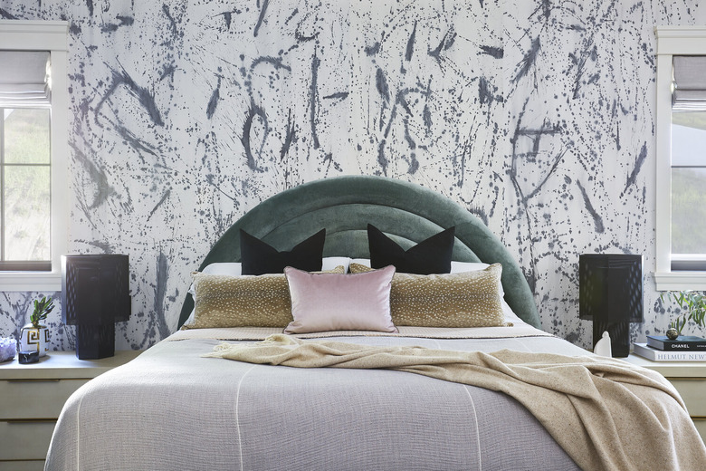 Anchor a maximalist bedroom with an eye-catching piece like this curved green velvet headboard and then build around it. Black Lacquer Design created a maximalist refuge that manages to be simultaneously soothing, yet still retain lots of character, thanks to an abstract patterned wallpaper and deer spot throw pillows paired with a cool, muted color palette.