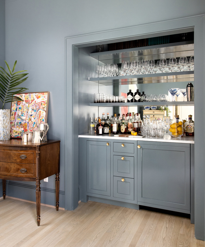 Blue-grays evoke a refined sense of elegance that's hard to rival. The cooler properties of the color make it a foolproof complement for vintage pieces and sleek brass accents, and regardless of where you use it, it'll feel as timeless as it looks. This monochrome dry bar by Zoe Feldman Design proves the adaptable nature of the shade and its ability to project a sense of collected cool.