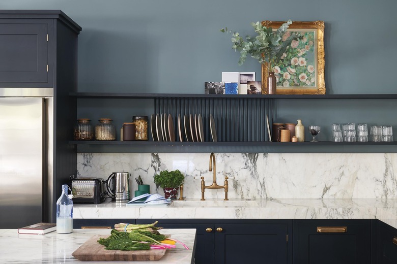 Blue in the kitchen is nothing new but doubling down on a complementary combo, like this one by Farrow & Ball, is as close to perfection as it gets. Instead of going for the classic blue cabinets and white walls, embrace a darker pairing — think blue and gray or black — to evoke a dynamic layer rooted in character.