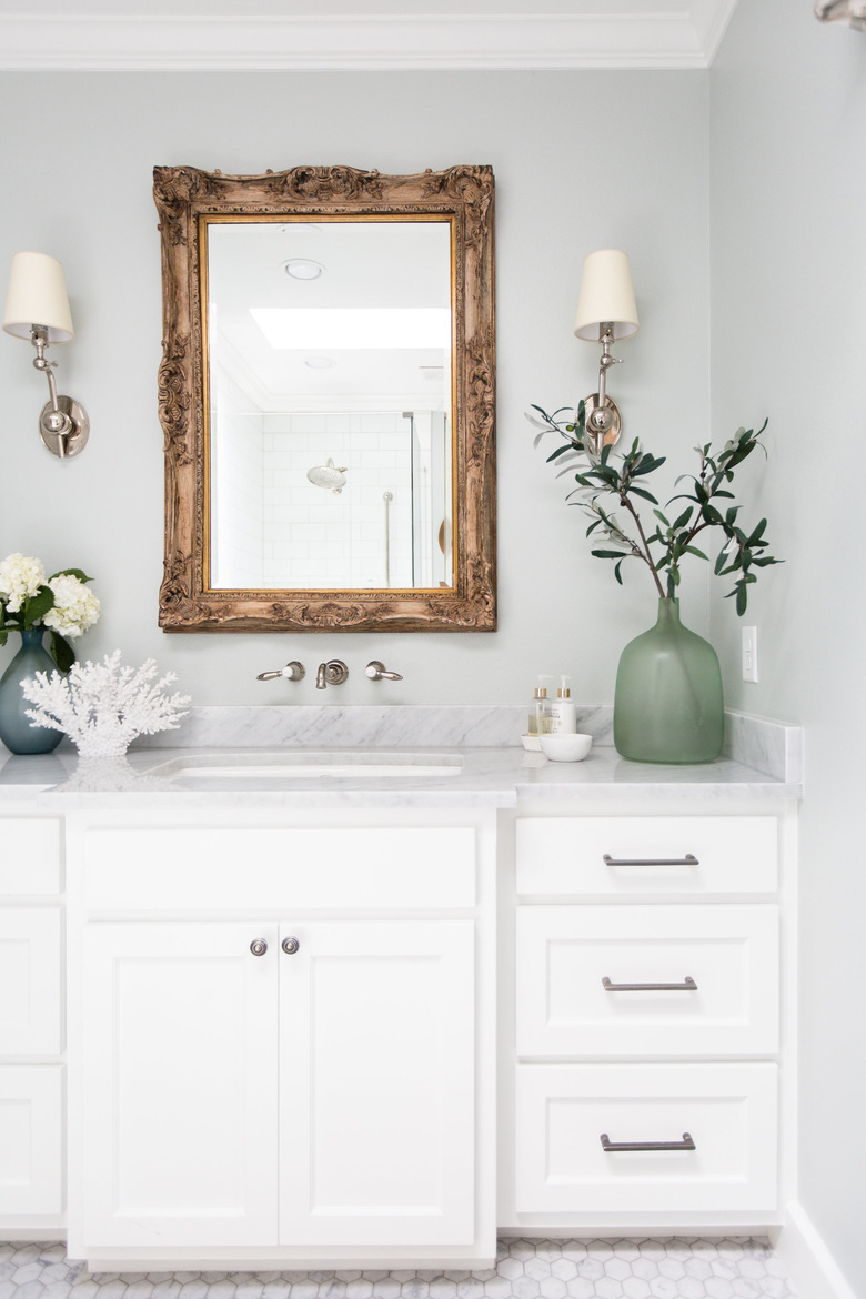 Powder blue never goes out of style and when it comes to the bathroom, and setting a calming tone, it's a no-brainer. The light-filled master bath in this darling craftsman home designed by Christine Zeiler Interiors illustrates the ethereal qualities of one of the most popular blue paint colors. Factor in the marble vanity top and vintage mirror, and we couldn't dream of a better setup.