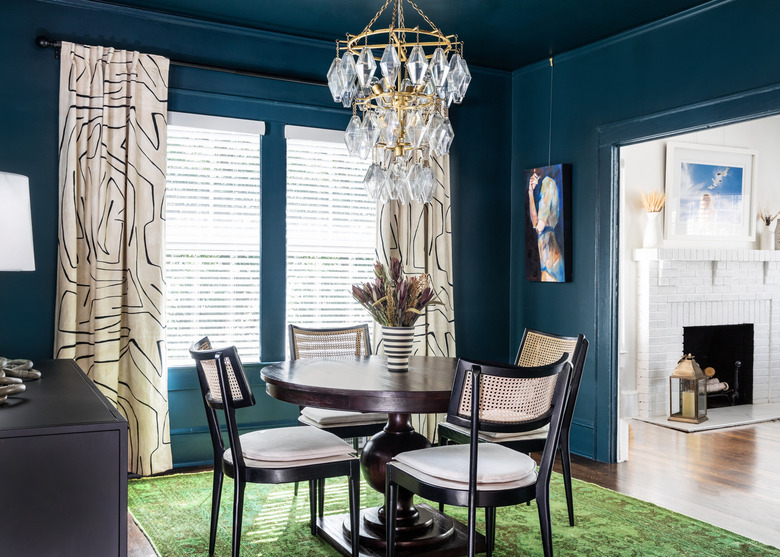 Setting the mood in a dining room goes beyond just the lighting — the color palette plays a huge role as well. And what better way to create a little ambiance than with a deep Aegean blue, like the one in this striking setup designed by House of Nomad? The Kelly Wearstler drapery fabric provides visual interest, while a larger-than-life chandelier brings on the glam. And thanks to the eye-catching blue paint color, this dining room dramatically contrasts with the all-white living room, just a few feet away, securing its spot as the focal point of the home.