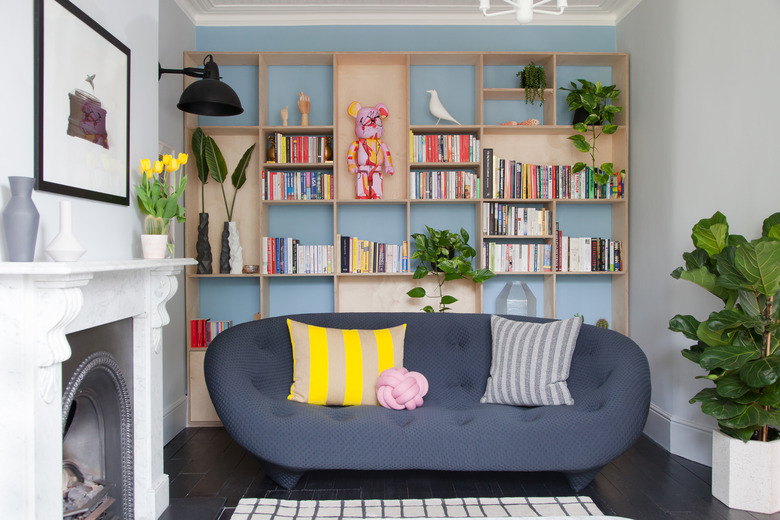 The sitting room was very narrow so the designers added a built-in bookcase brought and the Ligne Roset sofa closer to the center of the space. "We introduced the bright pop of blue behind that to make it stand out," says Whitehead.