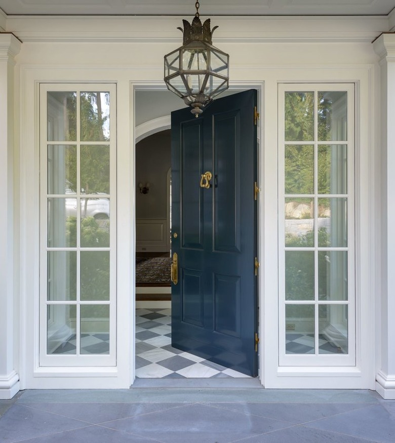 This gorgeous blue traditional front door from Massucco Warner easily sets itself apart from the ordinary because of the high-gloss paint. The brass exterior door handle, knocker, and pendant light also help give the space a refined feel.