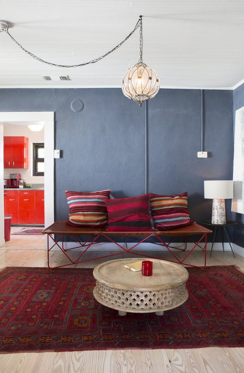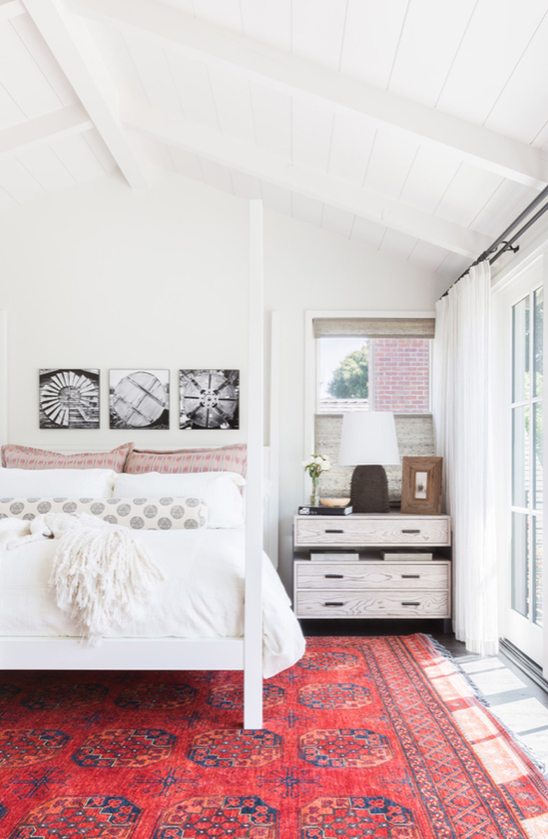 Try out a rich vermillion area rug in a light and bright space to ground things a bit. It will add just the right amount of cozy to your boho bedroom.