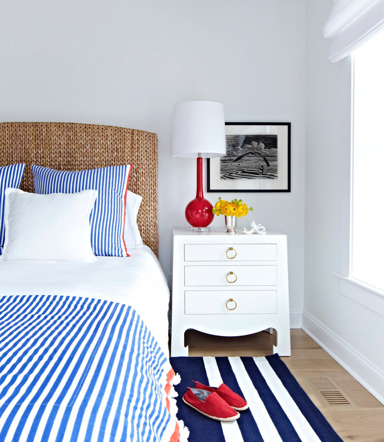 If you want to add just a touch of vermillion to your bedroom, do it with a table lamp like Chango & Co. did in this nautical space. It's the perfect accent for a kid's room or an adult one.