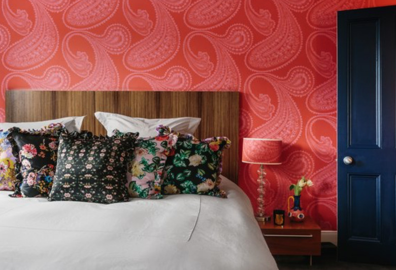 Like we said and will always say, an accent wall with a little pop of color will help you perfectly stir the decorating pot. But you can also choose a patterned vermillion wallpaper for something really dramatic in your bedroom. This space even has a lampshade in a matching pattern.