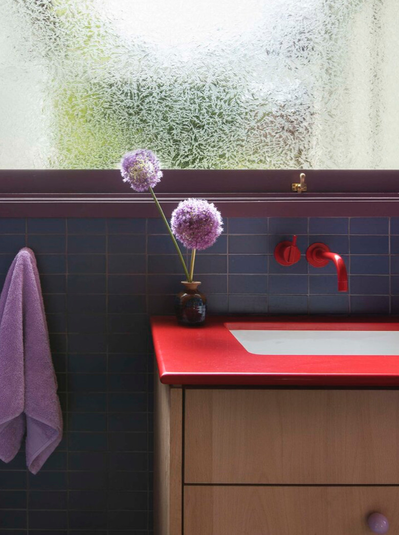 A red countertop may seem like an unexpected design decision, but this vermillion sink with a matching faucet from Reath Design has us rethinking color combinations. We're loving purple and vermilion together, and we never thought we would.