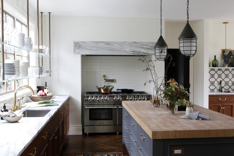 In this Washington State brownstone, with its sophisticated vintage-modern touches, designer Katie Hackworth hung open shelving in front of the traditional, Colonial-style windows. Because they're glass, the overall feel is still light and airy.