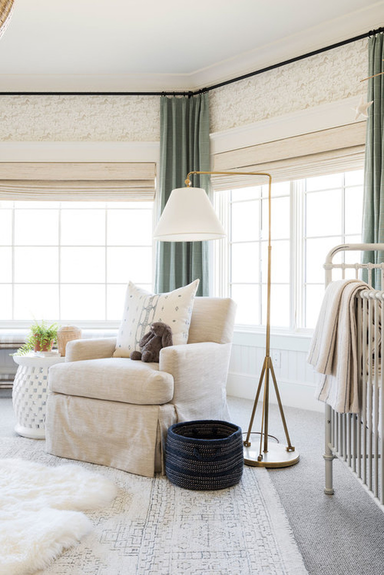 Studio McGee nails neutral rooms every time. And this one feels a little coastal with a bit of traditional style mixed in (thanks to the subtle wallpaper and brass floor lamp). But the celadon window treatments give this calm room the perfect punch.