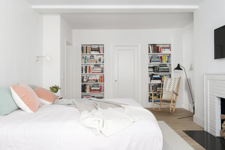 This nightstand is a darker variation of the celadon hue, but it still works. If your bedroom is mostly white, add a table like this one to create a little contrast. And if it's on the smaller side, don't worry. You can mount a lamp to the wall to increase table real estate.