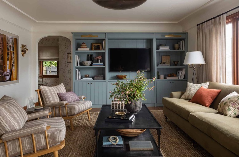 Can this living room be any more perfect? It's got vintage treasures; it's got lovely coffee table accessories. But most importantly, it's got that stunning celadon bookcase that holds the TV. Whether you have a built-in shelving unit, or you buy one, make sure it's this shade so you can create a focal point in your lounge space.