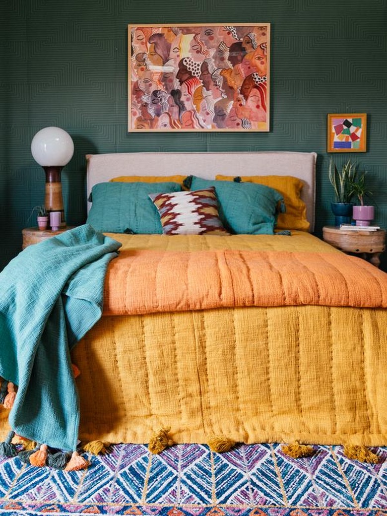Whoever advocates against multiple bed pillows is truly missing out on a major decor moment. For example, in this bedroom from Elizabeth Roberts, the celadon and coral cushions completely steal the show. Yes, they're minimal, but the throws add such life into the slightly Scandi space.