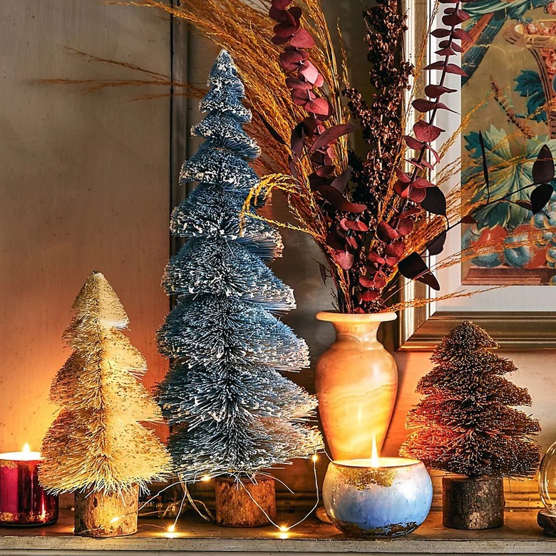 Inspired by Charm shows that a modern Christmas tree idea with the nostalgia of holidays past is possible when you combine timeless ornaments like snowflakes, icicles, and clip-on candles with an edited color palette and a slim-profile tree. The result is pure elegance with a rustic touch. A leather chair and thick-knit blanket enhance the winter wonderland vibe.