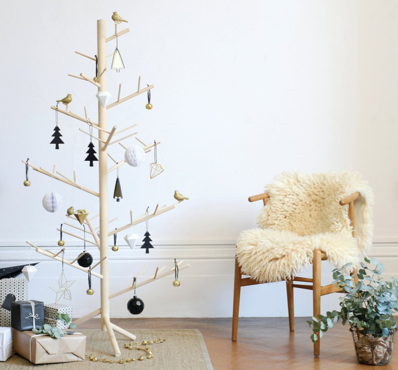 Bring home that festive feeling with a Scandinavian-inspired modern Christmas tree idea. Let this minimalist, wood peg beauty from Demelzahill be your guide — it's adorned with just the bare essentials and proves that less really can be more. Complete the scene with a wishbone chair draped in a sheepskin rug to add that cozy hygge vibe.