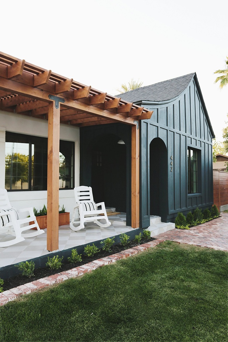 For a farmhouse-meets-modern cabin look, consider a dark, earthy shade of green for your exterior à la this house belonging to Nadine Stay. With undertones of black, the dark hue showcased on board and batten siding, no less, is simply head-turning. The wood door adds a warm, rustic pop that punctuates the picturesque setting.