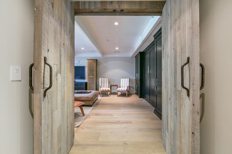 Interior solid wood doors manage to be cool and elegant at the same time. This space by Kelly Nutt Design highlights a gorgeous set of sturdy basement doors with rustic handles. And they open into a room that is just as simple and chic with more wood tones, recessed ceiling lights, and gray walls.