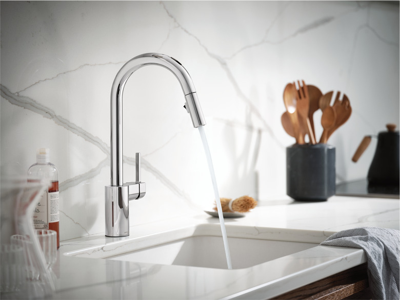 Kohler's bathroom and kitchen faucets and fixtures are known for their classic designs, but their Purist line is particularly streamlined and minimalist. Their touchless faucet uses an adaptive infrared sensor that gathers and analyzes the surrounding area after it is installed, which allows for calibration of the sensor and avoids false triggering. We're big fans of how this faucet is wall-mounted, making it easier to clean sink basins.