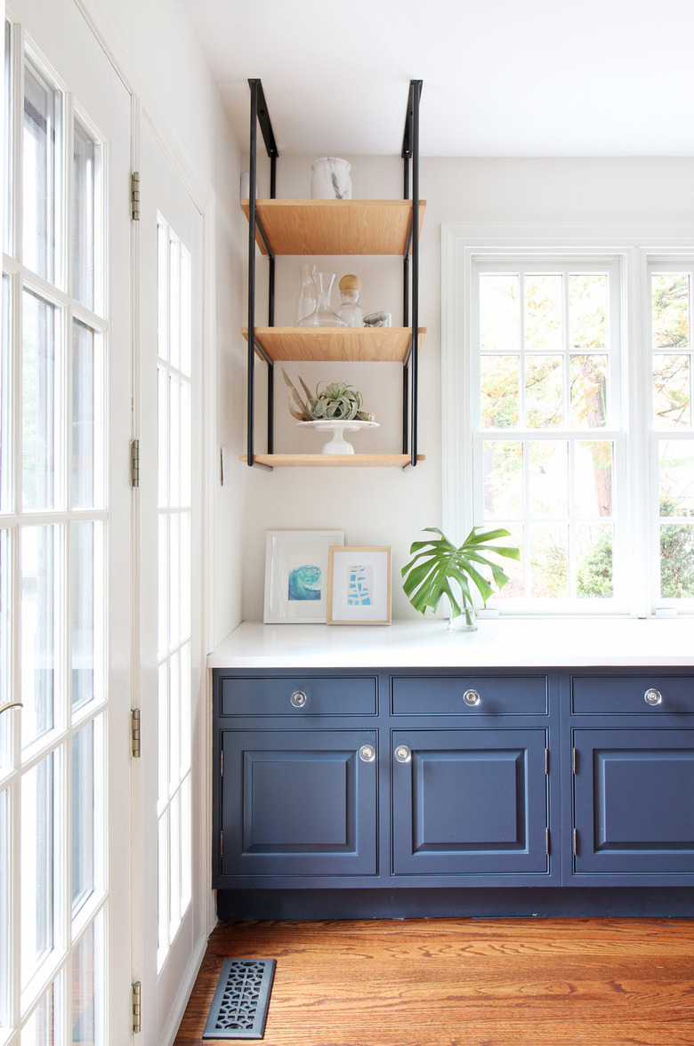 When it comes to coastal paint colors, you can never go wrong with navy blue. We especially love the look on the lower cabinets of this beach-chic kitchen designed by Chaney of Mix & Match Design Company.