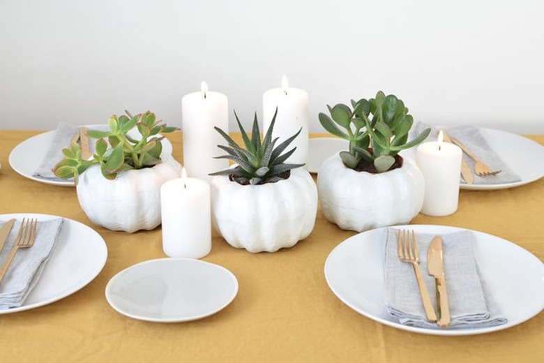 This DIY fall decorating idea from Hunker contributor Caroline Burke manages to bring in a bit of verdant greenery, making it a happy addition to your dining setup (or any room in the house) that can be enjoyed all year long. Add these to your table, nightstand, window sill, or kitchen countertop for a simple reminder of the season.