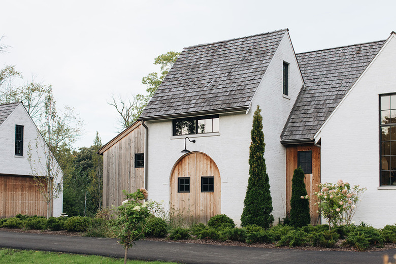 Reclaimed wood adds a dynamic quality to the white home exterior of this stunning build by Kate Marker Interiors. The combination of the whitewashed brick, wood doors, and the gray cedar shake roof might feel eclectic, but the rich tonal contrast between the materials adds character as well as a dose of interest.