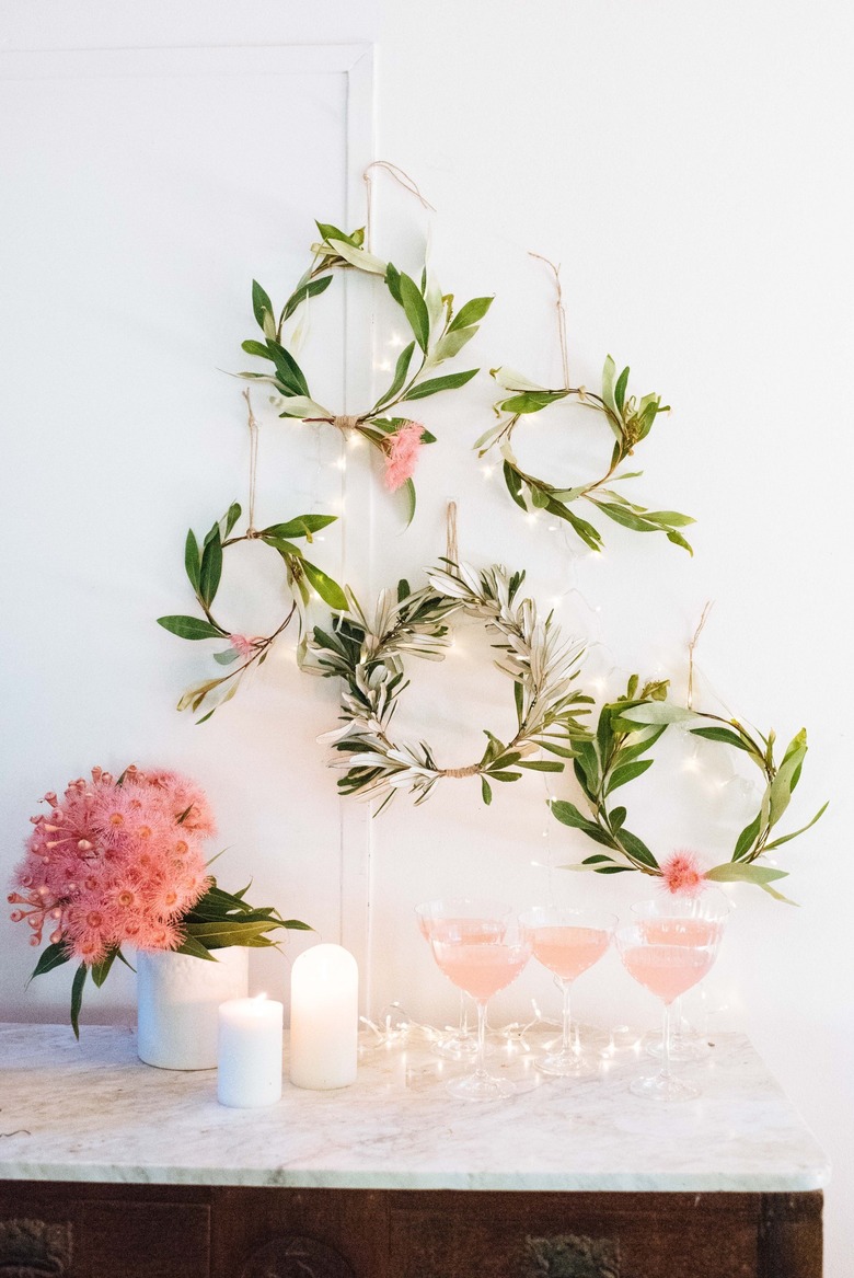 What's better than a Christmas wreath? Many Christmas wreaths. Collective Gen created a DIY tutorial for these decorations using sprigs of leaves and wire. Vary their materials and sizes just slightly to create a cohesive, interesting look. Then hang your wreaths in a gallery wall as a backdrop for a cocktail station.