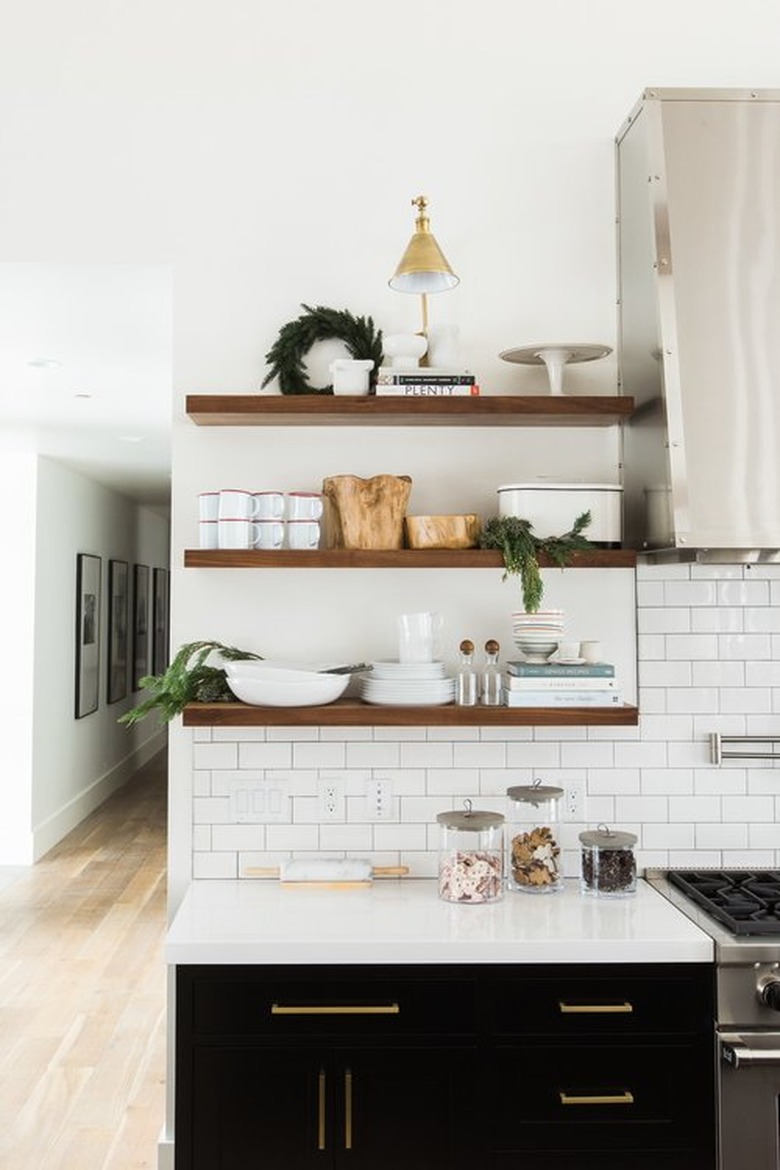 No need to give your front door all the wreath love. Take a cue from Studio McGee by adding color, texture, and a bit of Christmas cheer to open kitchen shelving with simple sprigs of greenery and a petite wreath. Think of all the nooks and crannies you could adorn with foliage: bookshelves, end tables, and bathroom shelves.