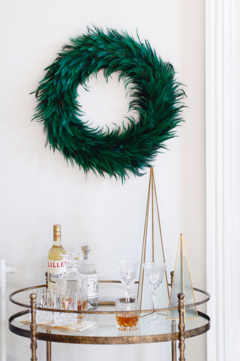 An OG home blogger, Erin Heimstra of Apartment 34 added a glamorous touch of holiday spirit above her, well, spirits. This gorgeous peacock feather wreath gives a nod to an F. Scott Fitzgerald-esque holiday party, especially when paired with ornate crystal stemware and a warming cocktail. Cheers!