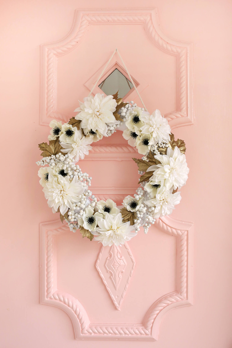 This gold and white wreath, a DIY project by A Beautiful Mess, can hang on your door from pumpkin spice latte season into peppermint mocha month. Using faux flowers, faux leaves, and a layer of spray paint, this pretty wreath transitions seamlessly from fall into holiday season. So elegant.