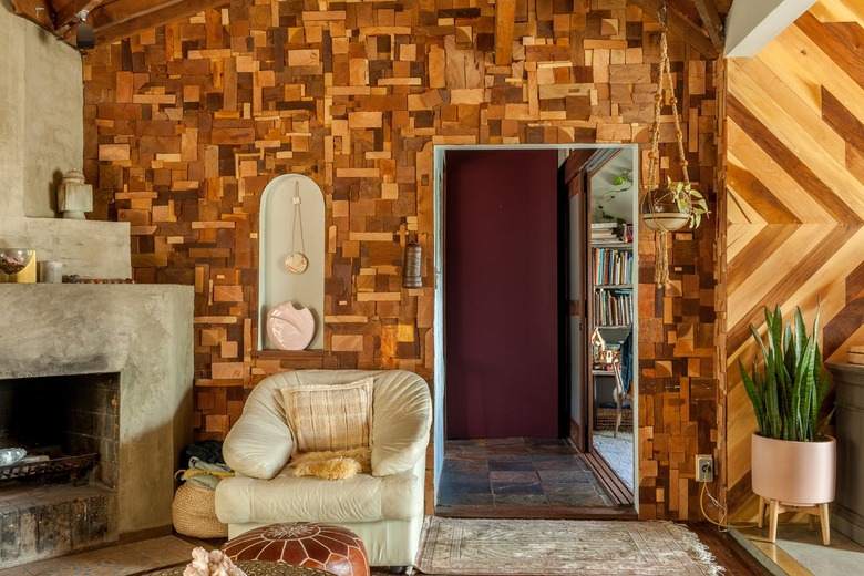 There's no rule when it comes to mixing multiple shades of one color. And this funky home proves it. Consider staining wood paneling with a more yellow finish and mixing in darker gold accessories for a warm and wonderfully unique space.