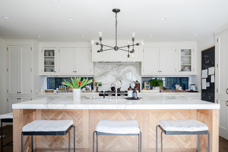 8. The wood herringbone design on this kitchen island is such a delightful touch. We also love that marvelous marble backsplash behind the stove.