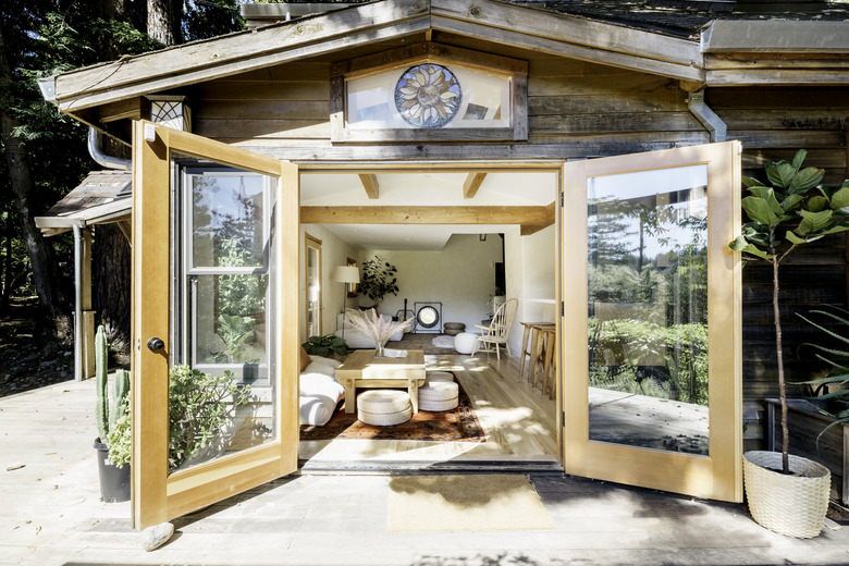 For designer Eva Holbrook and her partner, Jamie Williams, their cabin in the Santa Cruz mountains is more than a spot to escape the bustle of San Francisco — it's a place to commune with nature and heal. Holbrook sees the home as "an opportunity to disconnect from civilization, breathe in the fresh air, and rejuvenate on a cellular level." The cabin's setting, surrounded by old growth redwoods, tan oaks, and Douglas firs, inspired the relaxed design. "We wanted to promote grounding by using as many handmade, reclaimed, sustainable, and found objects/materials as possible," says Holbrook.