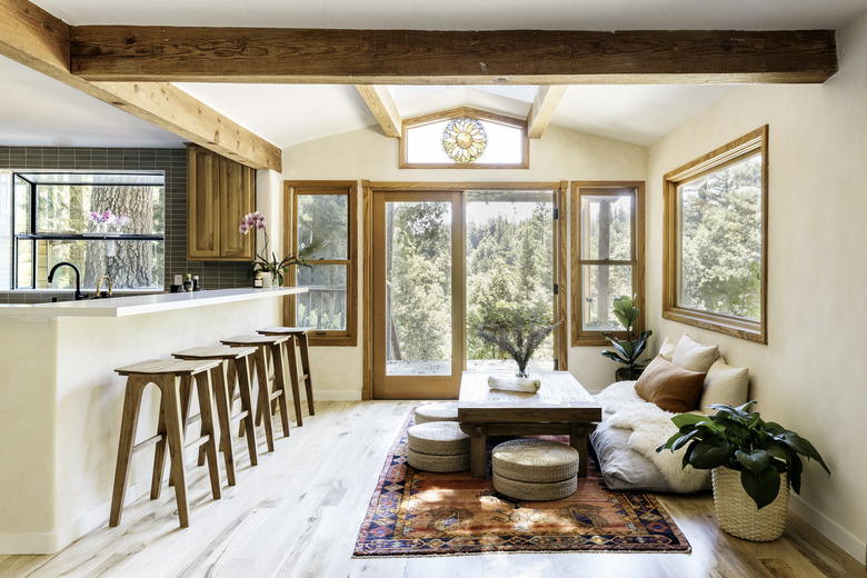 Holbrook kept the furnishings in the lounge/dining nook low to the ground, giving the space a relaxed vibe. The sustainably sourced oak floors are from Heritage Salvage; lime-washed walls achieved with Portola Paints brightens the space even more.