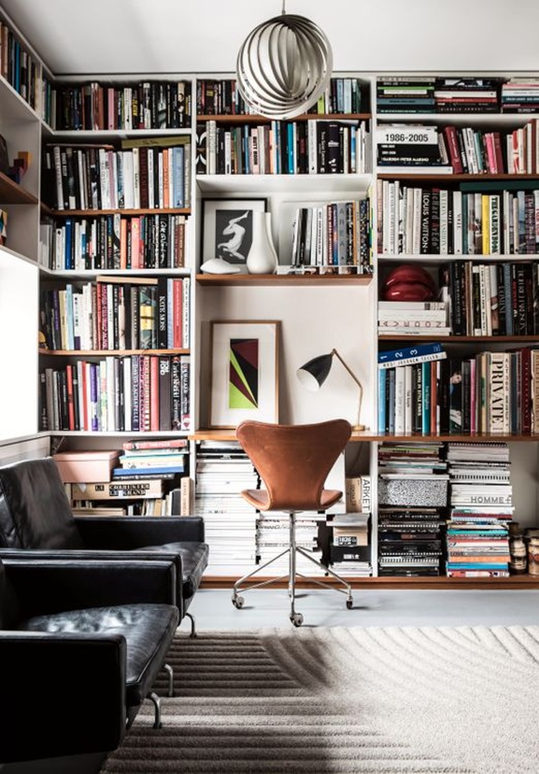 Space for a home office is often at a premium. But all you really need is a place to sit, a surface to work on, and something to light the way. In this fashion director's remote zone in Sweden, the sleek desk lamp establishes the space, while the book collection creates visual interest.