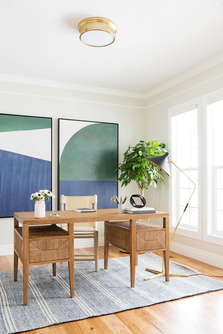 It's not like floor lamps are anything new, but as a home office lighting idea, they can be a bit unexpected. Be sure to choose something that fits the scale of the desk and the room, as Studio McGee did here. The McGee & Co. Mayotte Offset lamp is not only visually interesting, it's also able to provide an efficient glow. A table lamp and ceiling fixture provide alternate lighting options.