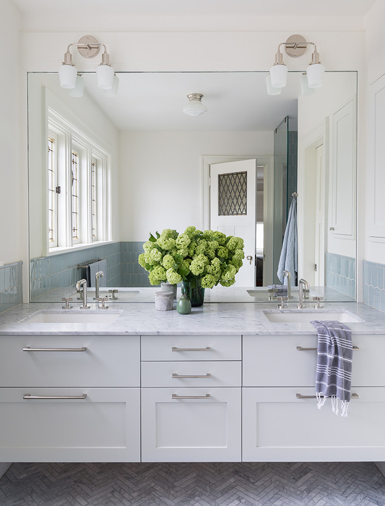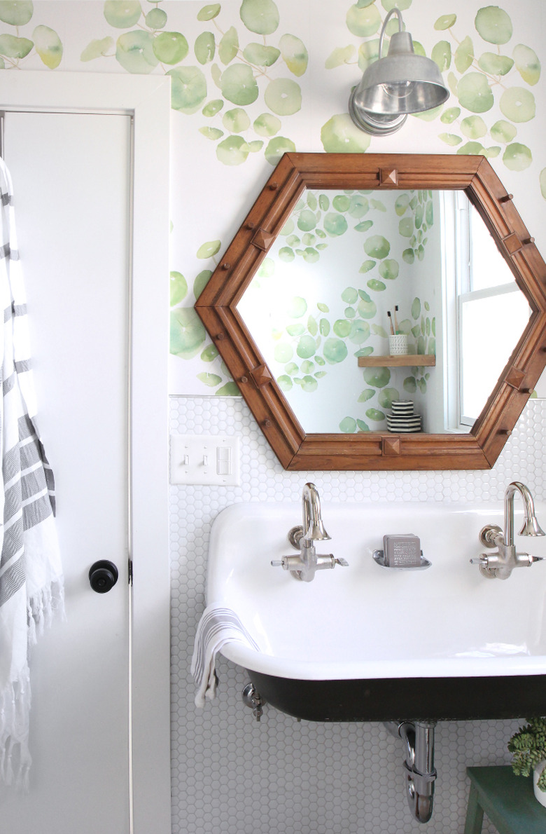 Take your bathroom to new visually expansive heights with a DIY bathroom backsplash idea that's often overlooked: The humble mirror. This traditional piece of decor is a workhorse that pulls double duty by giving the illusion of more space, while also functioning as a backsplash when it reaches the top of your vanity à la this timeless sanctuary by Ore Studios.