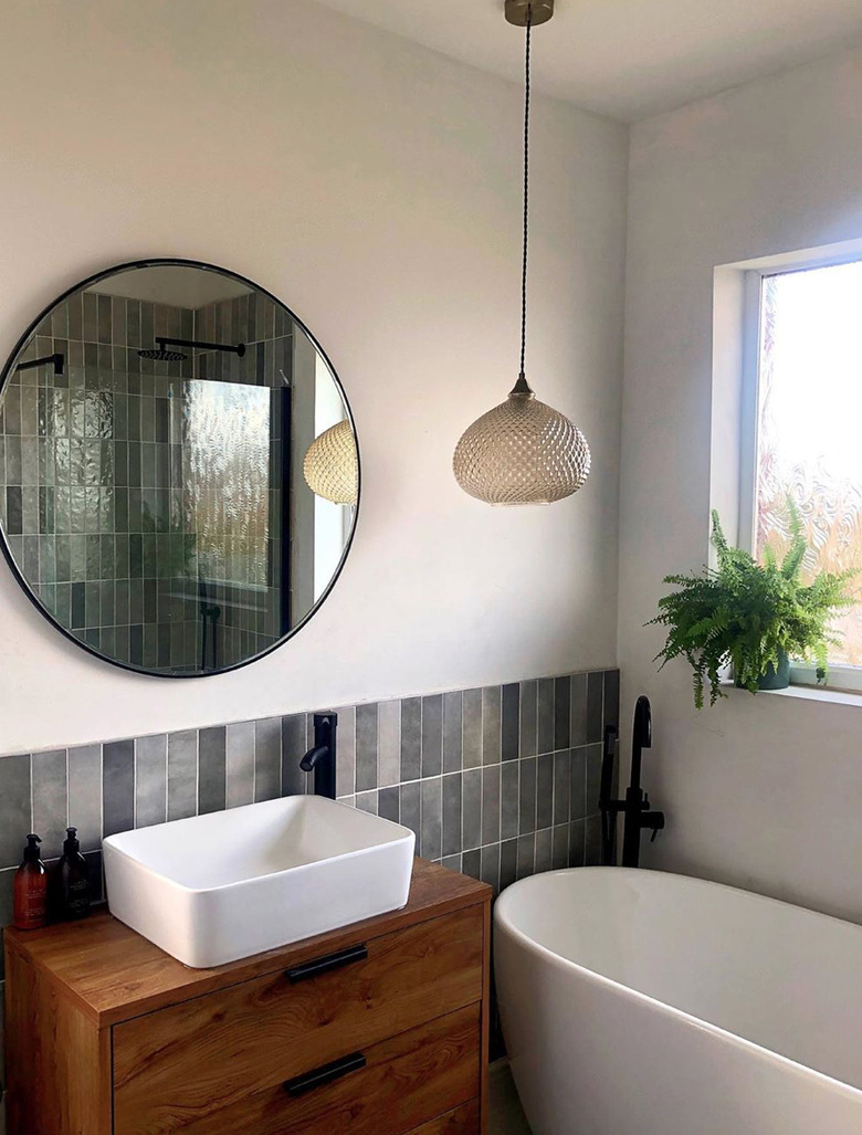 With a bit of online handholding and some time, you can tackle this DIY bathroom backsplash idea with professional results. Emma and Jack of Renovating The Broadway have been chronicling the overhaul of their fixer upper and recently unveiled this gorgeous midcentury-inspired space replete with wood vanity, vessel sink, vintage pendant light, and vertically-applied subway tile.