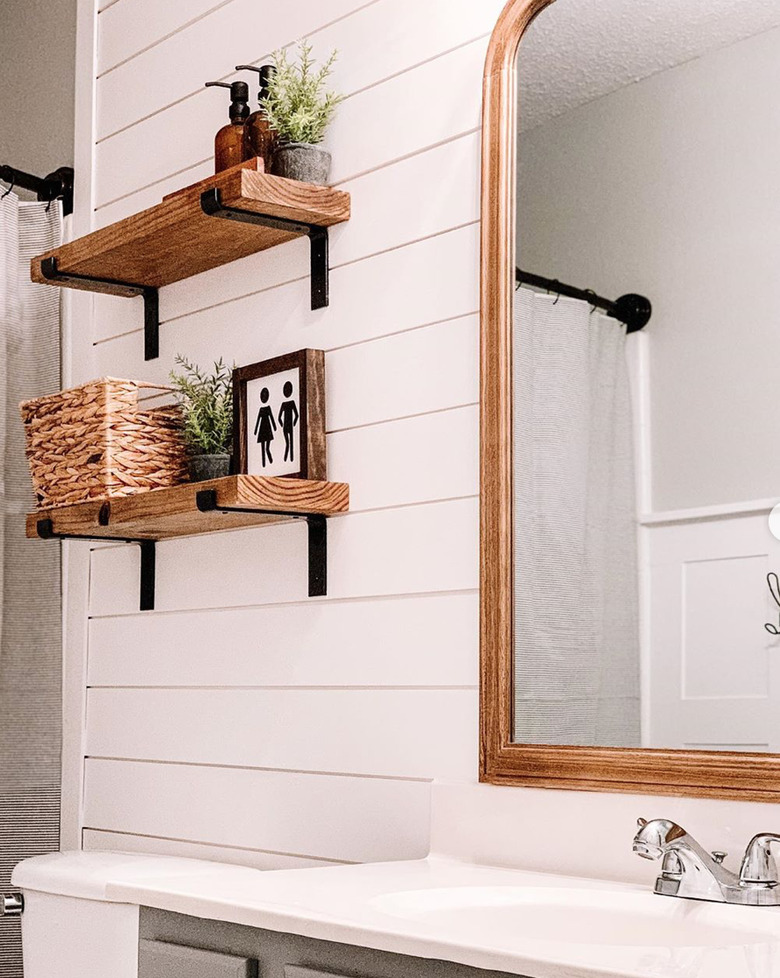 We believe in you, but if the thought of installing individual tiles and all that goes with it — spacers, levelers, and snap cutters — feels completely overwhelming, skip the hard stuff and choose a DIY bathroom backsplash idea with a built-in adhesive, like the peel and stick option that Jenni Yolo from I Spy DIY used in this youthful WC. It really is as user-friendly as it sounds.
