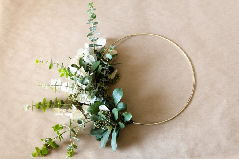 Rethink your winter wreath with this modernized makeover by Hunker contributor Whit McClure that's equal parts streamlined and festive. Use a gold hoop as the base and affix a small bunch of seasonal greens on the rim using wire or floral tape. The one-sided approach lends a clean-cut look that feels fresh and edgy.