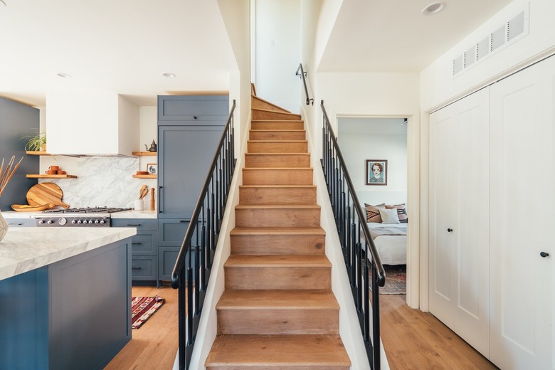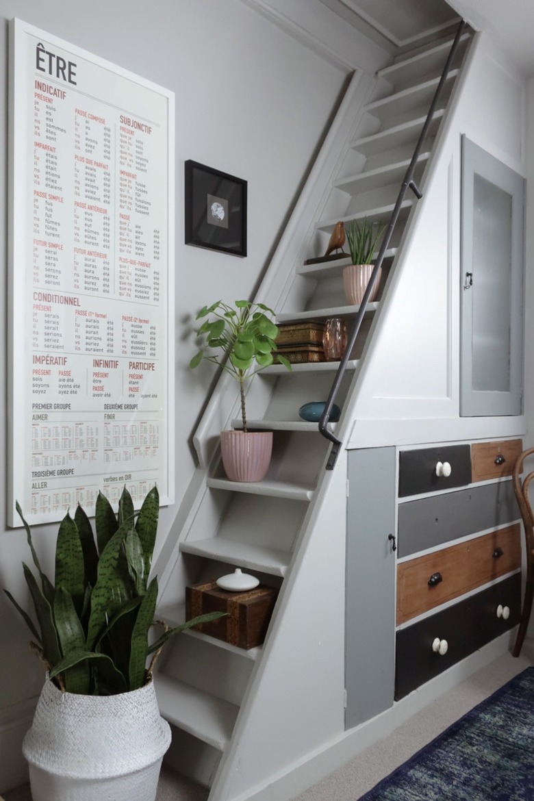 Envisioning a vintage staircase idea? Allow us to recommend installing a few mismatched drawers and an old-fashioned cupboard under your stairs, like Malcolm of Design Sixty Nine did in his home.