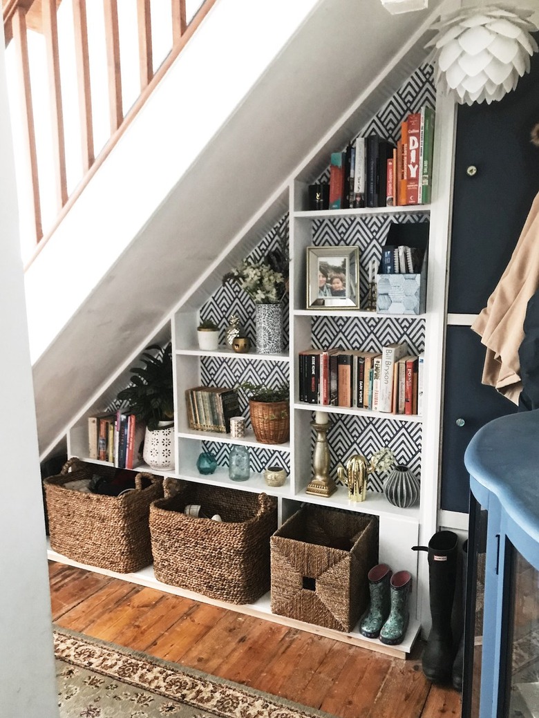 Oftentimes the awkward space under the stairs is the perfect size for a cozy bookcase. Either you can custom-build a shelving unit, which is what Melanie of Melanie Jade Design did in her home, or you can simply invest in a store-bought piece. Regardless, you can use the opportunity to artfully display your favorite pieces of decor, books, and a few baskets to quickly stash loose items.