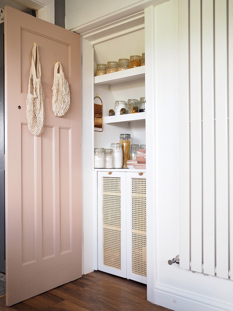 If you have a set of stairs close to your kitchen, you're in luck! That means that you could construct an oh-so-convenient pantry underneath, which frees up precious cabinet space. Olivia of Lust Living added super-stylish accents to her under-the-stairs storage space, including cane details and a pretty pink door.